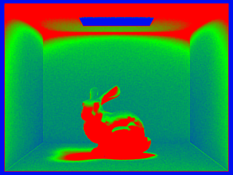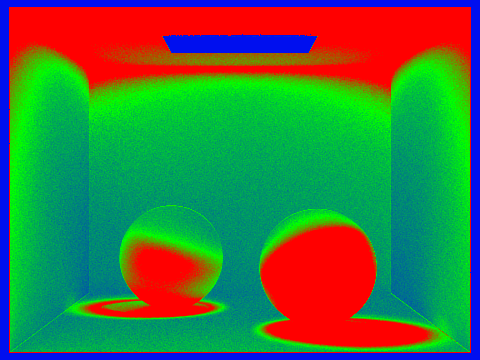 All rendered with 1 sample/light and max_ray_depth = 5. In the images below, blue means that convergence occurred with a low sample rate while red represents areas that required ns_aa samples.